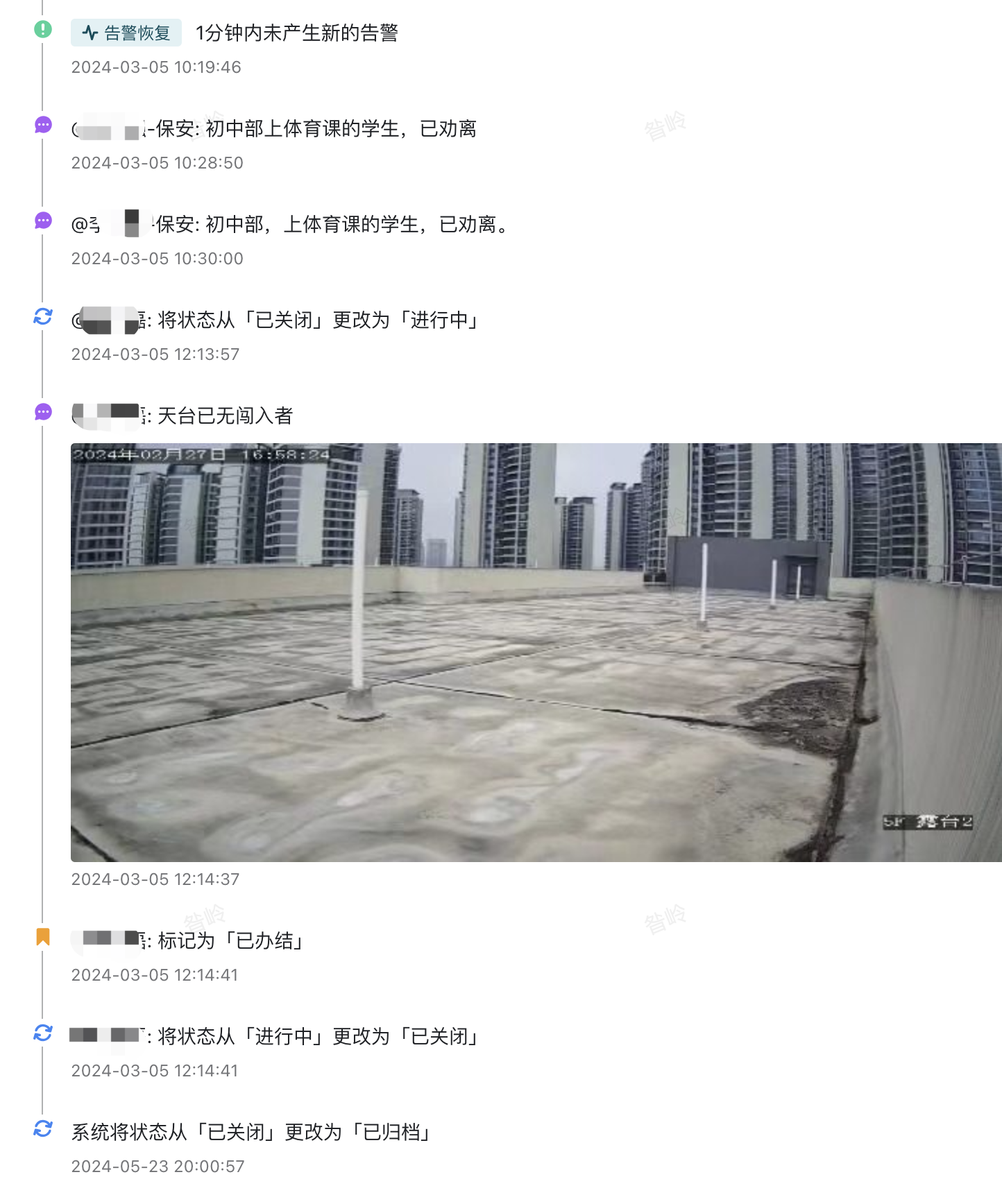 通过校安卫士智能识别,发现有学生上了顶楼天台。校园保安人员立刻赶到了现场,通过询问、安抚等方式将学生劝离。记录好相关信息后向该学生班主任及分管安全的老师汇报了情况。